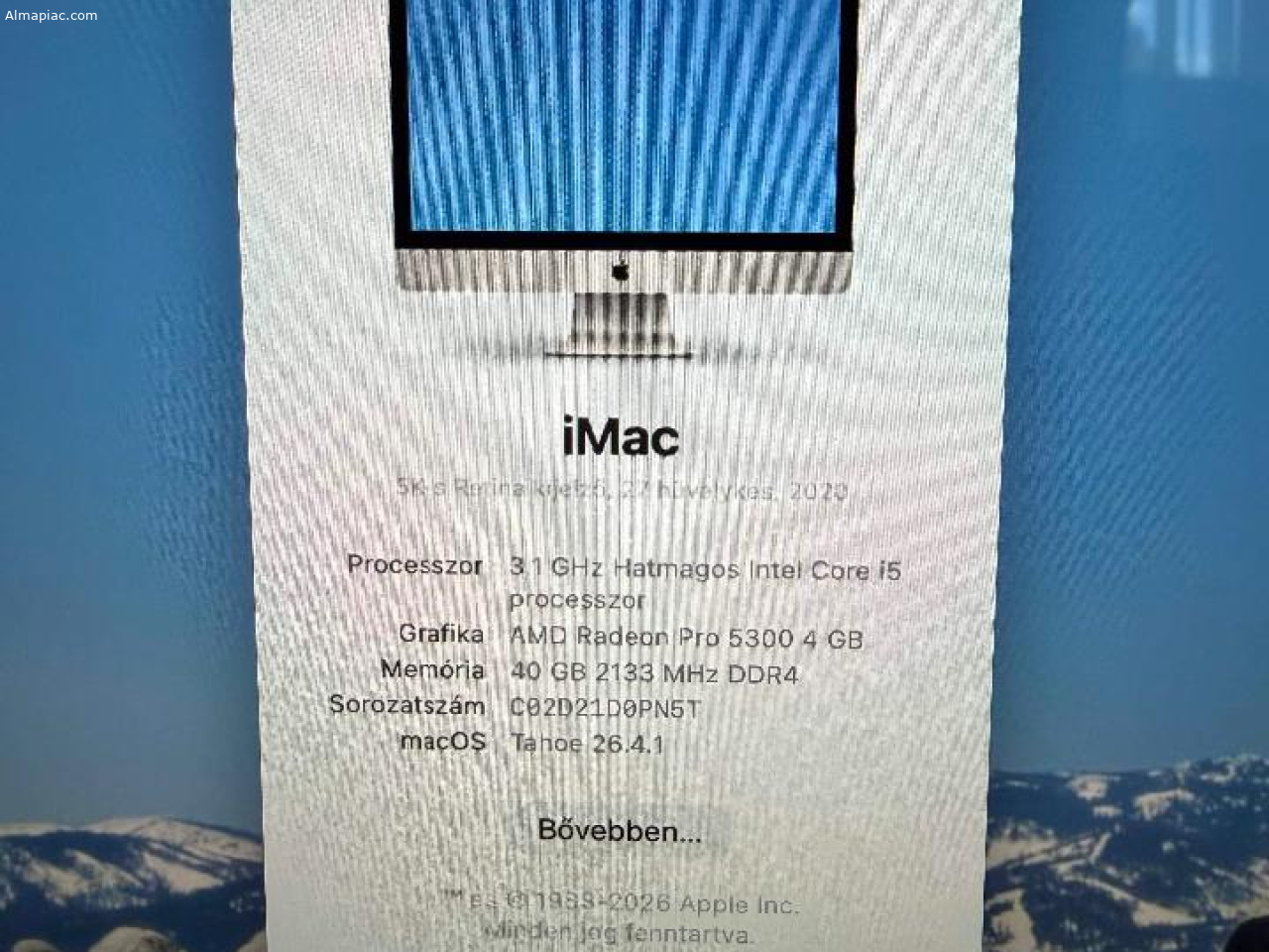 Kiváló és megkimélt műszaki állapotban -Core i5-6 Magos-3.10Ghz _40GB DDR4 bővithető -250GB SSD -AMD Radeon Pro 5300 4GB Grafika -27"Retina 5K kijelző(5120x2880) -macOS Tahoe op.rendszer -Fekete Apple Wireless Billentyűzet és egér
