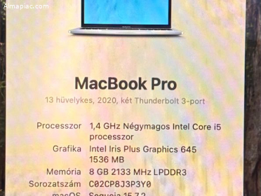 Apple MacBook Pro 2020 nagyon szép állapotban, jó akkumulátorral, 500 GB SSD tárhellyel, töltővel, kábellel eladó. Megtekinthető Szigetszentmiklós Lakihegyen, közel az M0-hoz.