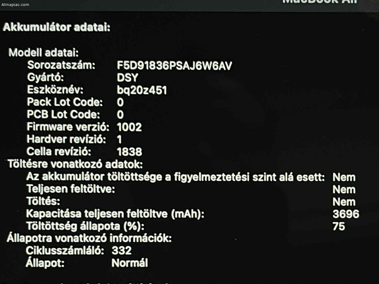 Eladóvá vált szeretett, megkímélt állapotú és hibátlanul működő, 2019-es Apple MacBook Air 13" 128 Gb laptopom. Ideális választás diákoknak, otthoni felhasználóknak vagy bárkinek, aki egy megbízható, stílusos és könnyű gépet keres a mindennapi feladatokhoz. Főbb Jellemzők és Specifikációk: Kijelző: Gyönyörű, 13,3 hüvelykes Retina kijelző IPS-technológiával és 2560x1600 képpontos felbontással. Processzor: 1,6 GHz-es, kétmagos Intel Core i5 processzor. Memória: 8 GB RAM. Töltési ciklus: 332